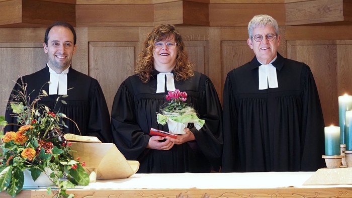 Bild: Pfarrerin im Probedienst Madlene Maciejczyk gestaltete gemeinsam mit Pfarrer Felix Klemme (l.) und Superintendent Volker Neuhoff (r.) den Gottesdienst zu ihrer Begrüßung in der Erlöserkirche in Elsen.